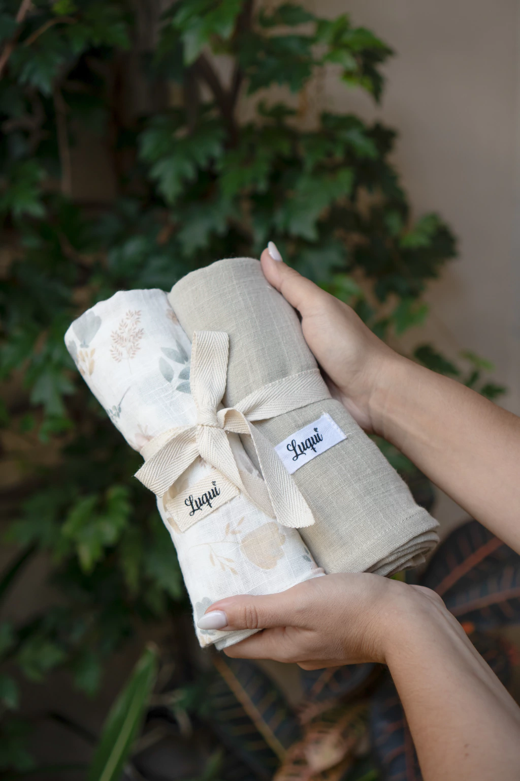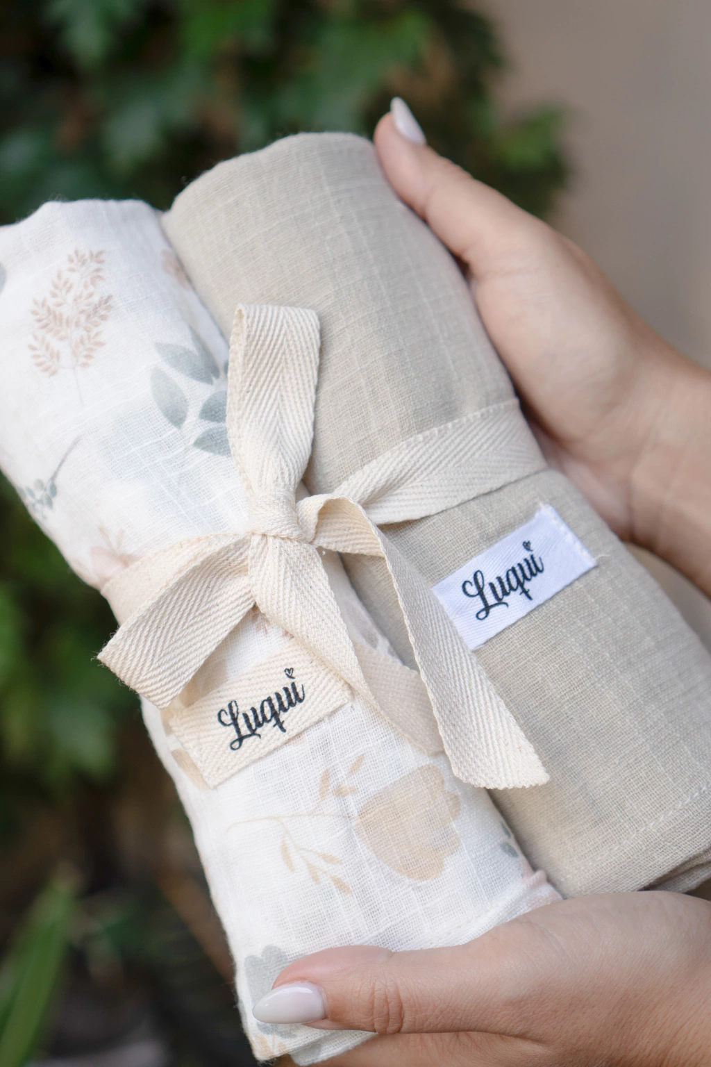 2 mantas de gasa 100% algodón, una lisa y otra estampada, presentadas en una hermosa caja con tarjeta alusiva.