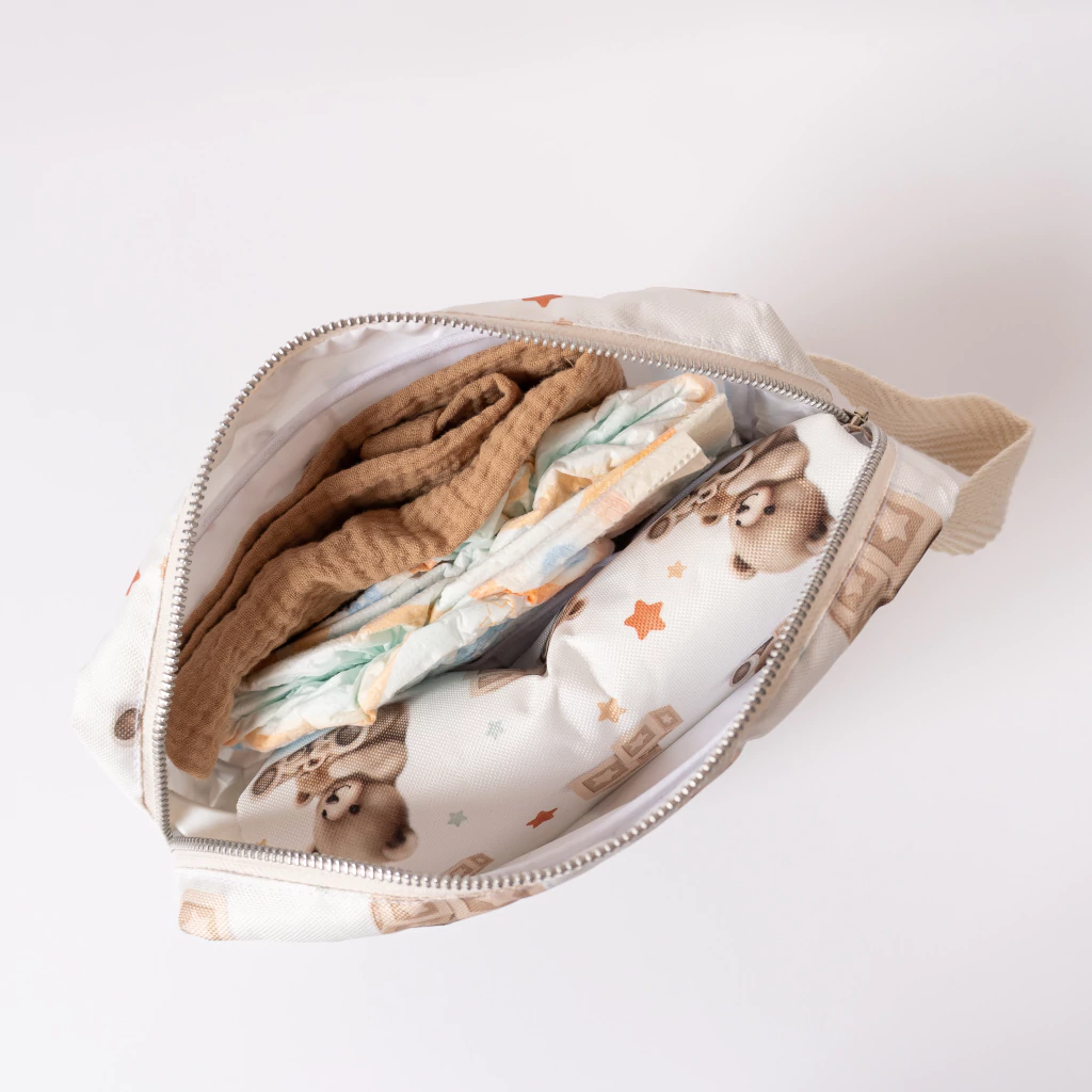 Es súper amplio! Ideal para llevar pañales, oleo, mamadera y hasta una muda de ropa.